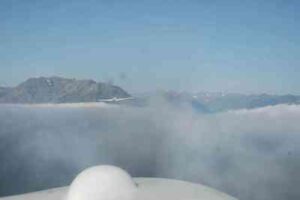 La visibilità lascia alquanto a desiderare, a vedere le condizioni sul campo viene voglia di rimettersi a letto a dormire, ma decidiamo di tentare lo stesso, al massimo torniamo indietro. In effetti più andiamo avanti peggio è, siamo al pelo tra la foschia di sotto e le nubi basse di sopra, ma dopo mezz’ora di volo, quando già sembrava di dover mollare
