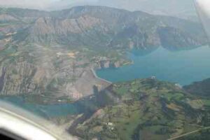 Si inizia a scendere, passiamo sopra Barcelonette, seguiamo la valle della Durance, passiamo sul lago di Serre-Ponçon, purtroppo la visibilità cambia un po’, c’è un pelo di foschia, comunque nulla in confronto a quello a cui siamo abituati noi in Val Padana, la visibilità rimane comunque ottima.