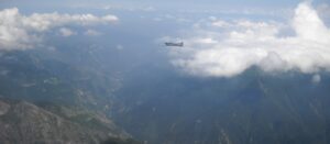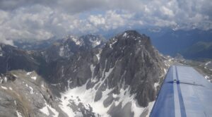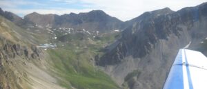 Ed ecco che siamo quasi al colle, l’aria é tersa e fresca, anche troppo (siamo in maglietta …), ma comunque é sempre uno spettacolo meraviglioso svolazzare sulle nostre montagne, altro che la pianura padana …. Naturalmente i motori a queste quote (siamo intorno ai 3000 m) iniziano a rendere ben poco, ma da buoni volovelisti sfruttiamo le termiche e le dinamiche per fare quota, che qui non mancano quasi mai.